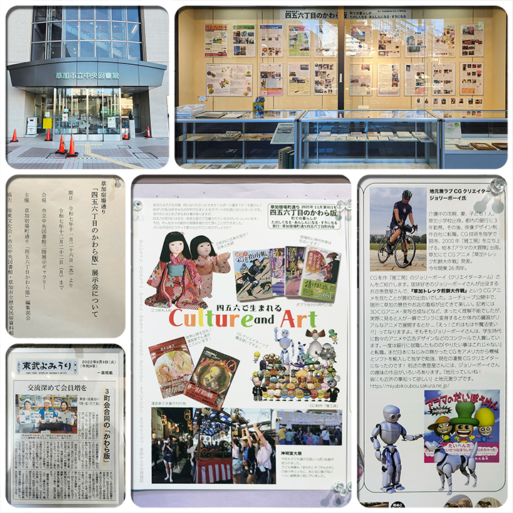 456丁目かわら版展示/草加市立図書館 (2025年11月26日訪問/11月26日記載) 入口 >トップメニュー >美術とCG >現ページ うちの地元のかわら版の最新号が11月26日に発行されたのと同時に、市立図書館にて「かわら版の展示会」が始まりました。 最新号では、うちのCG工房も取り上げていただきました(^^)ゝ 12月22日まで開催中~♪