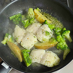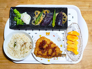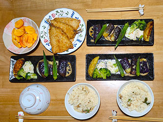 あさりご飯、茄子とオクラとレンコンの生姜煮、白身魚と野菜のバジルソテー、他
