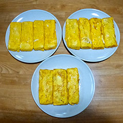 3品目串(教会の愛餐会用/出し巻き玉子、ウィニーの砂糖醤油ソテー、チーズ)