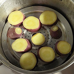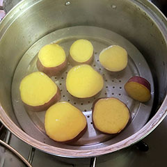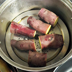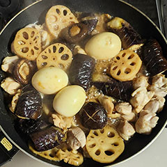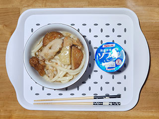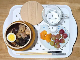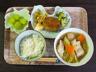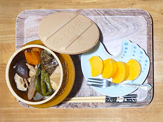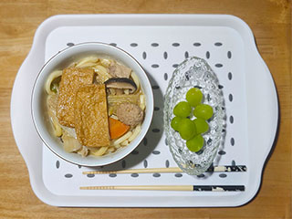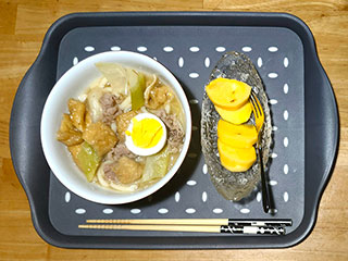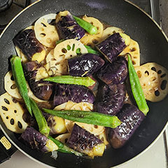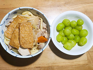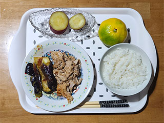 肉汁うどん、茄子とオクラの生姜煮、蒸かし芋
