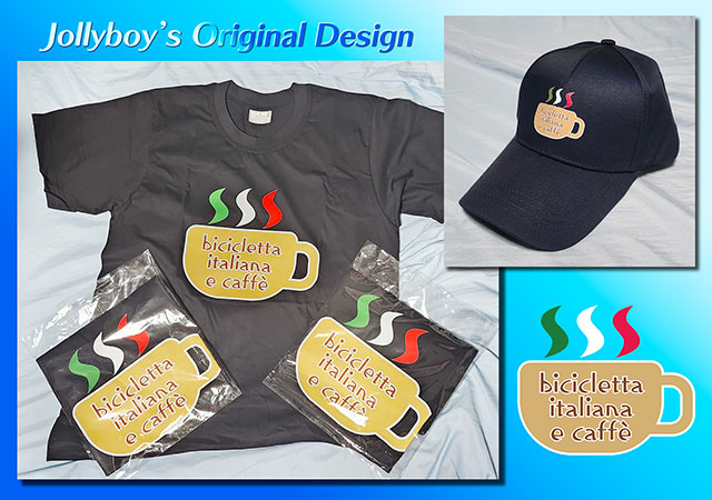 コーヒーカップに、イタリア語で「イタリアの自転車&珈琲」と文字を入れ、イタリアン・トリコロールカラーの湯気が立ち上る完全オリジナルの帽子(^^)