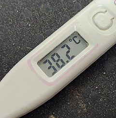 ノドの痛みや関節痛などの症状は収まってませんが、熱は平熱近くまで下がってきた。
