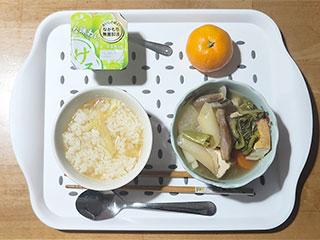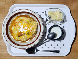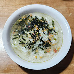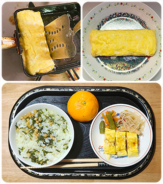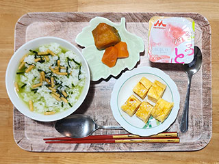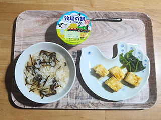 何を食べるかは日々の観察でだいたい分かっているので、食べられそうなおかずだけ出し、プラスして何か加える。今日は玉子焼きにしました。御飯は白米のままだとなかなか食べないので、お茶漬けにしています。