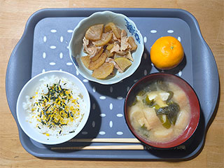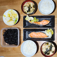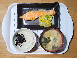 焼き鮭と4種の具のお味噌汁、ゆず白菜の漬物にしました。