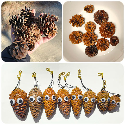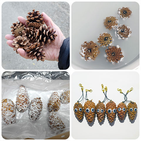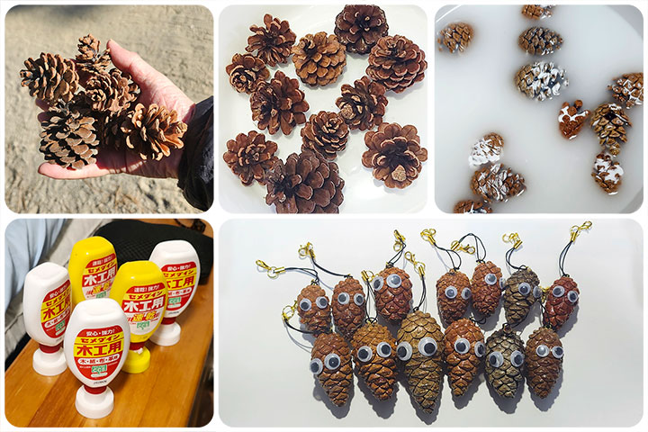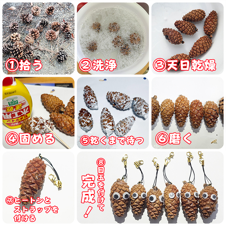④乾いたら、ヒートンとストラップと目玉を付けて完成。