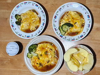 今日のパパ夕飯は天津丼。デザートは、杏仁豆腐とリンゴ。