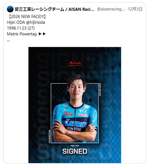 織田聖選手も、マトリックス・パワータグから愛三工業に移籍する。(※聖選手は3年前までEFの育成チームに所属していました。コロナ禍で育成チームは消失)。