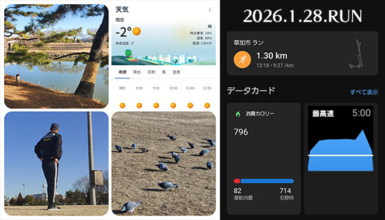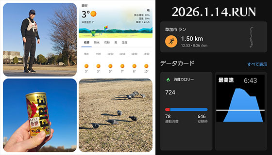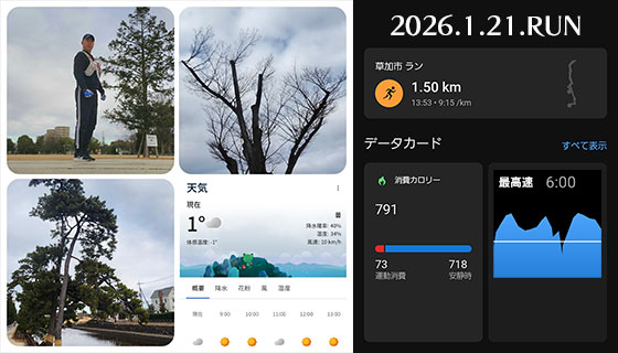 気温1℃、体感温度0℃と寒いけど、太陽で出ていて、久しぶりに真冬ランでうっすら汗をかきました。
