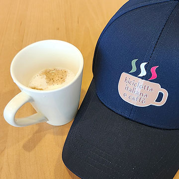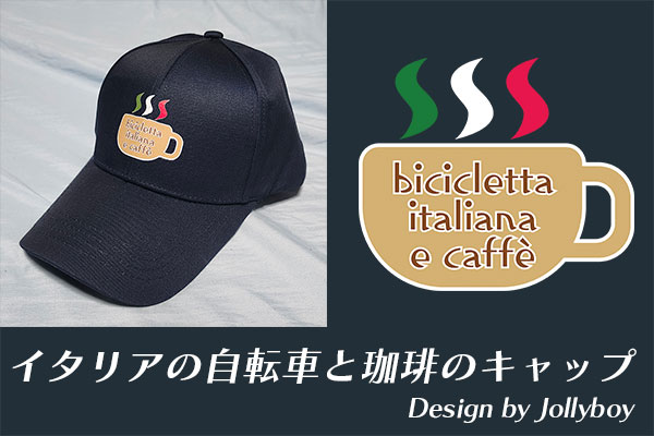 コーヒーカップに、イタリア語で「イタリアの自転車&珈琲」と文字を入れ、イタリアン・トリコロールカラーの湯気が立ち上る完全オリジナルの帽子(^^)