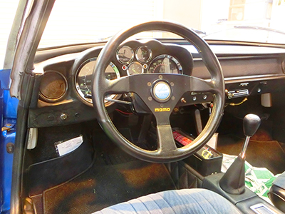 ※アルピーヌの運転席。とても狭く、背の高い人、太った人、関節の固い人は、ドライバーズシートに座るだけも一苦労。足元はもっと狭く、くつろぐスペースは皆無。正にレーシングカー・コクピットと言った感じ。