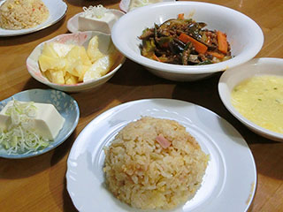 夕方、雨の中、買い物へ。パパ夕飯は、黄金炒飯、麻婆茄子、中華玉子スープ、デザートは桃。