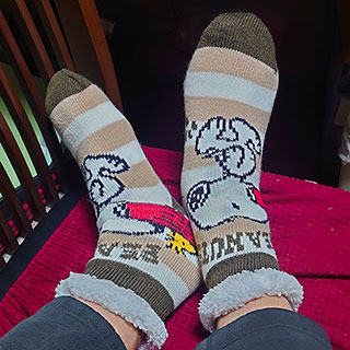で遂に、以前プレゼントでいただいた「スヌーピーとウッドストックのモコモコ靴下」を使う!(笑)