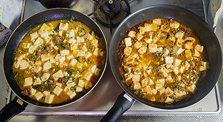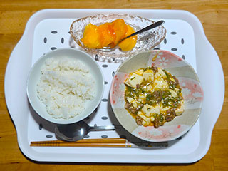 今日のパパ夕飯は、麻婆豆腐の甘口と中辛(我が家で辛口派は自分だけなので2種類)。下段は母用。