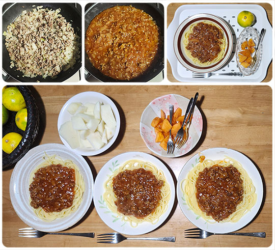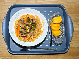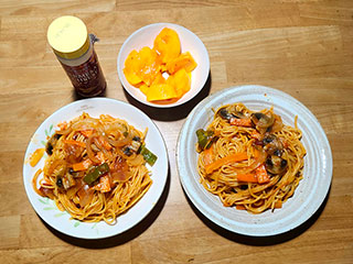 今月最後のパパ夕飯は、ナポリタンスパゲッティ。デザートは柿。右は母用。