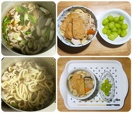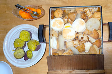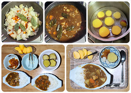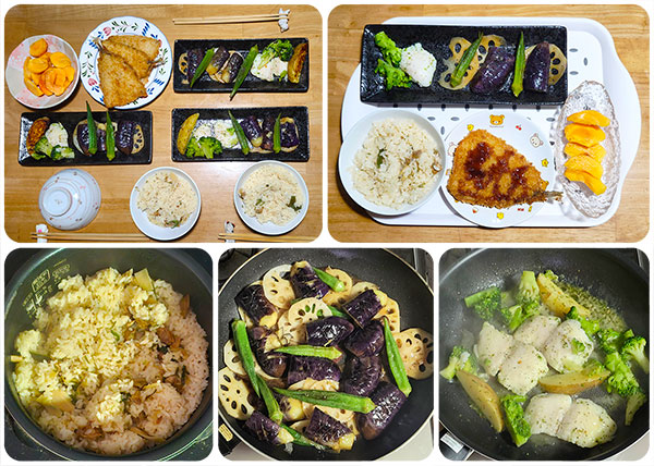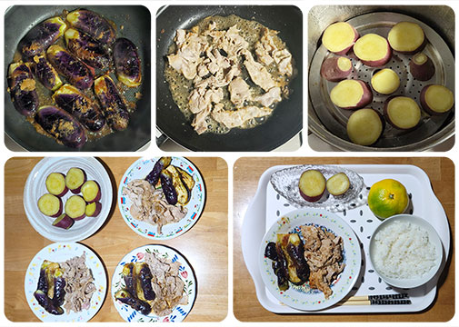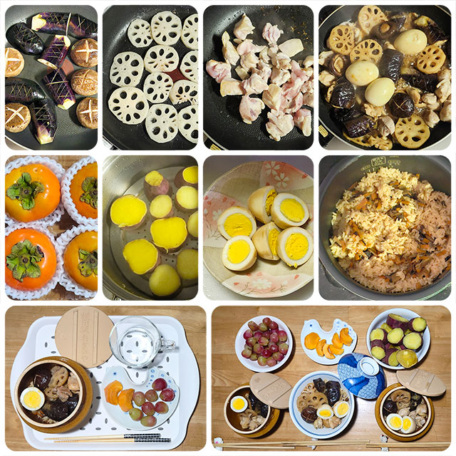 9月は「五目御飯+筑前煮」の組み合わせでしたが、10月は秋らしく「キノコ炊き込みご飯+生姜煮」の組み合わせ。 茄子・椎茸・レンコン・鶏肉を焼いてから、生姜・醤油・日本酒・味醂・砂糖で煮込む。茹で玉子も投入し煮玉子にする。