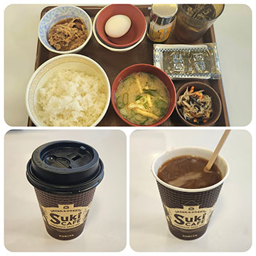 今朝のモーニングはコメダでなく、最近はまっているすき家の朝定とホット珈琲。玉子かけご飯、海苔ご飯、牛丼の3種の味が楽しめます♪