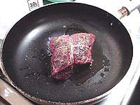 4.フライパンにバターとサラダ油を入れて熱し、下ごしらえした2の肉を盛り付けた時に上になる側から焼き、焼き色がついたら少しずつ転がし、肉の表面全体にしっかりと焼き色を付ける(※フライパンの下にたまっている油をスプーンですくって肉にかけてあげると、肉がぱさつかず全体に火が早く通りやすい)。